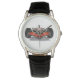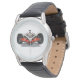 メンズクラシックブラックレザーストラップウォッチは、レースフォーミュラ車の写真プリントで示される。いくつかのスタイルから選択こカスタマイズの時計は買まに見える。ストックイメージ