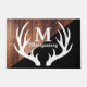 ぱりっとした白いシカの(雄ジカの)枝角のシルエットが付いている深い、金持ち、素朴な茶色の木の納屋の板、黒くモダンな対角線およびあなたの名前入りな姓およびモノグラムの手紙。