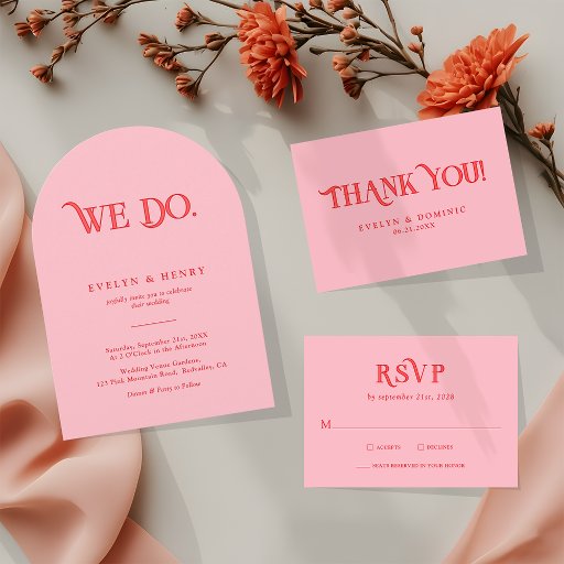 モダンなピンクと赤の結婚式リハーサルディナー 招待状