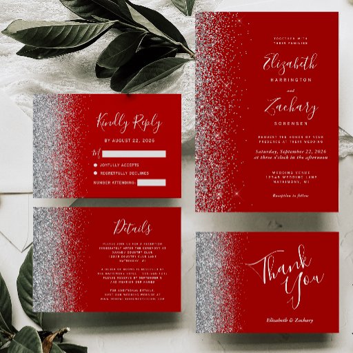 モダンな深紅と銀の輝きの結婚式 オールインワン招待状