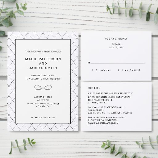 モダンエレガントクラシック結婚式招待状 – 白黒のジオメトモダンリデザインを備える。クラシックとインフォーマルフォーマルなミニマエレガントリストの結婚式の両方に使用すモダンる。カスタマイズとプリントを今すぐ。
