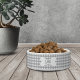 このパーソナライズされたモダングレーとホワイトのバッファローチェック柄のペットボウルで、あなたの大切なペットを贅沢に扱ってください! ドッグボーンの形のペットの名前でパーソナライズできます。