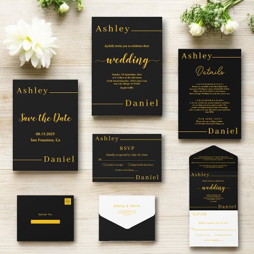 このエレガント黒と金ゴールドの結婚式招待状はモダンの結婚ための完璧なシンプルデザインは黒い背景に金ゴールド書を備えている。