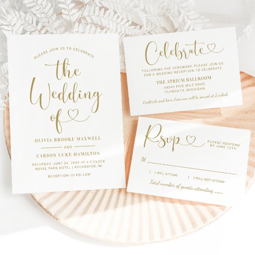 金ゴールドフォイルモダンとホワイトの結婚歓迎ギフトメッセージカードはシックな書き物とハートアクセントとスタイリッシュブラックタイポグラフィデザインを備えている。カップルシンプルの名前と彼らの日付と一緒にパーソナライズされたすることができると結婚文字。