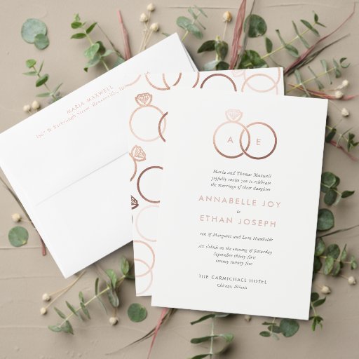 モノグラムモダンは、バラ金ゴールドのリングが絡み合ったグラム結婚と文字を取り入れパーソナライズされた、柔らかい赤面のピンク、グレー、白の文字を合理化した新しいクラシック結婚式招待状スイートとなる。このオンラインRSVPカードのすべての文字をパーソナライズし救済、あなたのウェブサイトにゲストを向け結婚て、いくつかの木と郵送料の救一部を。