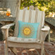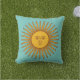 この屋外の枕で夏の至へようこそ。あなたのポーチのシーティングエリアまたは別の屋外の生活宇宙に設定。金ゴールドの太陽を中心にターコイズの青い背景を特徴とする枕。裏面は太陽の模様がある。