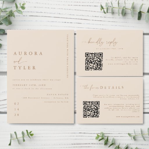 シンプルでモダンなベージュのギフト ノート カード。スクリプト レタリングと、ゲストがスキャンして寄付できる QR コード付き。お好きな文言にカスタマイズするか、そのまま使用できます。