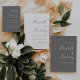 このエレガントミニマ結婚リストのサンキューカードはスタイリッシュ、グレーの背景に白の手書きスクリプトを備えている。カップルの名前と日付を結婚sans serifフォントで追加する。