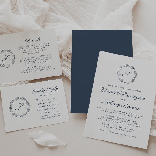 Classic Indigo Blue Monogram Wreath Script Weddingデザイン: Akhates Designs