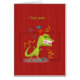 赤い背景に巨大な白い歯を持つ可愛いライムグリーンのモンスターの漫画の文字"私はあなたの愛"と。このカードは冗談として友人に送るのに最適だろう。