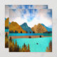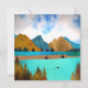 抽象芸術の風景でユニーク、質感は山と湖の風景を示し、孤独な舟と日の出と日の出素晴らしで、青、ティール(緑がかった色)、シアン、金ゴールドの色合いを持つ。