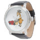 赤いおもしろい芝刈り機のオリジナルアートデザイン腕時計を押す素晴らしいヤギはおもしろいギフトをユニーク作る。注文時にカスタム文字を追加し、背景色を変更できる。