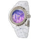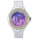 ヤシの木の写真の画像とエキゾチックな女性の時計。必要に応じて独自の写真をアップロードする。白いガーリーブレスレット時計バンドと結晶とベゼル。モノグラムモダン文字を含む番号ダイカスタムアール顔なし誕生日エレガントギフトアイディアのための女性と女の子。ガールフレンド、娘、妹、母、従姉妹、花嫁、花嫁結婚などの作成。ネオンピンクと紫のフィルターを持つ熱帯プリント。
