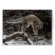 ユキヒョウの幼いこどもは木を離れて雪に急襲するために跳躍します。