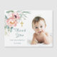 ベビー写真ありがとうバプテスマ/《キリスト教》洗礼式や命名式カード。このデザインは、ユーカリの葉、牡丹とアネモンの花のイラストレーションを水彩スタイルで特徴とする。上には十字架のイメージがある。