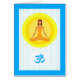 オムシンボルのグリーティングカード。呼吸に時間を取る。女性がヨガ/瞑想ポーズで座るこの紙グリーティングカードのカバーに。淡青色のオブジェクトモデル記号が背景に塗りつぶされる。デジタルイラストレーション。画像と詩の著作権© Shoaff Ballanger Studios.