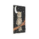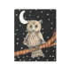 白い三日月と白い星かわいらしを持つ黒空の木の枝に座って青いネックレスを身に着けた薄茶色のフクロウを持つメタルウォールアートプリント。