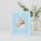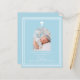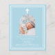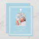 白い枠と白いクロスで構成された明飾るい青の背景をカスタマイズし、写真の名前と詳細を追加。白文字。アーチ形のフォトフレーム。1枚= 1枚の招待状を印刷したエッジからエッジ