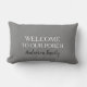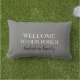 素朴なモダン灰色ようこそ私たちのポーチのスクリプト、家族の名前、ルーンバー屋外の枕。カスタマイズして、文字と前後を変更し、独自の名前を追加できる。
