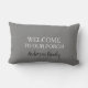 素朴なモダン灰色ようこそ私たちのポーチのスクリプト、家族の名前、ルーンバー屋外の枕。カスタマイズして、文字と前後を変更し、独自の名前を追加できる。