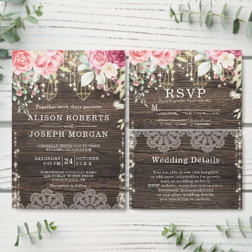ラスティックウッド フローラル ストリング ライト 婚約 招待状