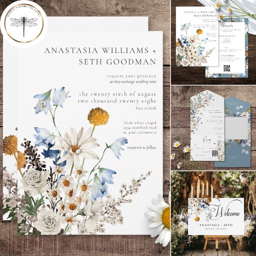 ラスティック ダスティー ブルー ワイルドフラワーズ & デイジー ウェディング プレイスカード