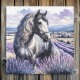 馬の壁のアートかわいらし。ラベンダーの畑に立つ白と灰色のかわいらし馬。これはaiで作られ、水彩色のスタイルで行われた。