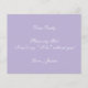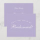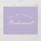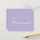 ラベンダーの背景に白い文字の、シンプルでミニマルなウェディングドレスの提案メッセージ。ラベンダーはウェディングカラーでもある。フロントには「Bridesmaid」という言葉が、バックにはメッセージが、優雅なカリグラフィーで書かれている。小文字で「[名前]、私のウェディングドレスの仲間になってくれる?」というアーチ型の文字が「Bridesmaid」という言葉の上に。