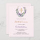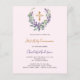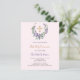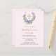 ピンクの背景。ラベンダーの花、水色のユーカリの緑と黄金の十字架で作られたフローラリース。名前と詳細のパーソナライズおよび追加1枚= 1枚の招待状を印刷したエッジからエッジ