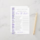 水エレガント色ラベンダーフローラブライダルシャワーどのように良い花嫁のゲームを知っている。花嫁を知っている人を見るためにゲストが質問に答えるおもしろいとインタラクティブなアクテ最高のィビティ。誰もが楽しんで楽しん祝でいる間に花嫁を楽しめ保る甘い方法婚約しただ。このデザインは水彩薄紫とラベンダーガーデンを備え、茎の色合いは紫と新鮮な緑の色を帯び離れている。花は優雅に横に流れ離れて、ゲーム与えカードaとモダンtouch。クラシックセリフフォントとスクリプトエレガントタイポグラフィの組み合わせにより、ゲースタイリッシュムは簡単され読る。完全にカスタマイズ可能で、質問、フォントの色、および背景を編集して、ブライダルシャワーテーマに合わせることができます。このアクティビティは魅力的、任意のお祝いに個人詳細を追加する。
