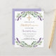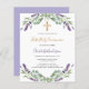 ラベンダーの花飾とユーカリの緑の白い背景。パーソナライズ、名前と詳細。背中:ラベンダー、紫の色の背景。1枚= 1枚の招待状を印刷したエッジからエッジ