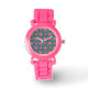 赤かわいらしとピンクの花のカラフルパターンと深いの青と緑の背景に黄色の水玉模様を持つキッズピンクのグリッターストラップ時計。Posh & Painterly 'Rangoli'コレクションの一部、このパターンは任意のWristwatchに合わせて調整することができる。