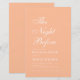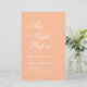 シンプルでミニマルなピンクの招待状です。背景はピンクで、白い文字のみが入っています。「前夜」というタイトルは優雅な筆記体で、「リハーサルディナー」と名前は大きな大文字で、他の部分は小文字で左揃えになっています。