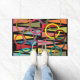 黒のフィールドにモダン三角形とリングのレトロな色のミッドセンチュリーデザインを持つ。