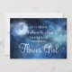 ルナー・スカイ フルムーン 天の川 水彩画 デザイン。夜空の輝く星々と、輝く月 デザインを贅沢なネイビーブルー、パステルブルー、紫の水彩テクスチャで表現。モダンなタイポグラフィのスクリプトフォントを使用。トレンディで魔法のようなデザイン - パーソナライズされたウェディング フラワーガールへのプロポーズカード!