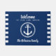 "ようこそ私たちの湖の家"あなたの家族の名前パーソナライズされたでフォーマット。美しいネイビーモダンブルーにシックなボ航海のートいかりを搭載。