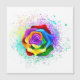 白い背景に虹の花びらを持つ大きな咲き誇るバラ絵を描、カラフルの飛び散りとともに、明るく絵を描す。3次元