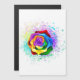 白い背景に虹の花びらを持つ大きな咲き誇るバラ絵を描、カラフルの飛び散りとともに、明るく絵を描す。3次元