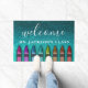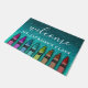 ターコイズブルーフェイクグリッターの背景が輝いているようだ。ピンク、紫、青、ターコイズ、緑、金ゴールド、オレンジ、赤のレインボー色のクレヨングリッター。白はっきりした文字読「ようこそ」でシャルボードフォント。簡単に先生の名前または教室のタイトルを更新する。他の多くのスパークリーな背景色とデザインで利用可能。
