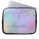 紫ガーリー、ピンク、青、緑と黄色の背景にフェイクグリッターを滴らせるユニコーン色のレインボーを搭載した可愛いラップトップスリーブ。スワッシュを使用したスタイリッシュトレンディー紫のスクリプトで自分の名前でパーソナライズ。