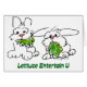 2つの可愛い漫画のピンクの鼻のバニーのウサギは、ランチのためのレタスのムンチの口を持っ読ている…キャプション"レタス楽しみU".