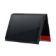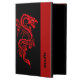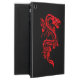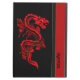 iPadエアケースカスタム、スタンド内蔵、黒で行われ、赤い中国のスタイルドラゴンのグラフィックスと前面と背面。赤いバンドは、ケースの前右縁の下に、自分のためにパーソナライズする準備ができてカスタムいる文字黒いアイディアを素晴らし持っている。