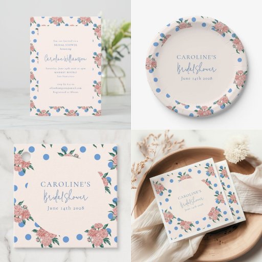 レトロな芍薬の花のガーデン 青い水玉模様のウェディングシャワー カスタム ペーパーカップ