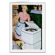 彼女のピンクの服および青および白いチェック模様のエプロンのレトロの50年代の主婦は彼女が彼女のモダンな洗濯機の家族の洗濯をすると同時に微笑します。 衣服の完全なバスケットはまだ床の彼女を待ち構えます。 カードの内部は言います、べと病が"。置く前に"時々成功はドライヤーにちょうど洗濯を得ています