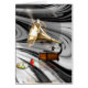 レトロ-空白のなカードの時間。 ばら色の蓄音機およびレトロの白黒渦巻の背景の時計。 あなた自身のメッセージのための左のブランク。