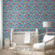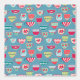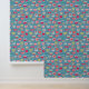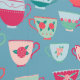 パステルかわいらしピンク、ブルー、グリーン、レッドのレトロなティーカップをティール(緑がかった色)ブルーの背景に。オリジナルアートby Nic Squirrell.キッチン、ダイニングエリア、レストラン、ティールーム、カフェに最適。