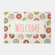 ドーナツが転がり落ちる可愛い柄のウェルカムドアマットのまわりに。ピンク、グリーン、ブラウン、クリームの色は本当に与えこのデザインはレトロ感じな。