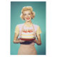 1950年代のヴィンテージの美学を持つ明るい母親で、ポルカブラウスとエプロンを着点々のあるて、スマイルは明るく飾、イチゴとキャンドルをトッピングした美しいケーキを持つ。ティール(緑がかった色)の鮮やか背景はレトロな雰囲気を高め、懐かしさと暖かさを喚起。ベーキング、母性、お祝い、レトロスタイルのテーマに最適。