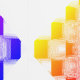 おもしろいレトロ80sピクセル化ゲーマーガラスキューブ赤い黄色のブルーパープルと白の正方形トイの部屋、キッズルーム、ゲームルームなど。