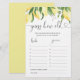 私たちのアイテムであなたのお祝いに愛の甘みを絞る!水の色のレモン鮮やかや植物的な要素の魅力が満ち、これらのアイテムは喜びの熱狂的な宣言である。柑橘系の色合いと緑豊かな緑の楽しい組み合わせは、爽やかでロマンチックな雰囲気を醸し出している。このデザインの絡み合った受け入れにブライダルシャワーを浸魅力的し、愛のお祝いに参加するゲストを招待。一致する項目が使用可能。
